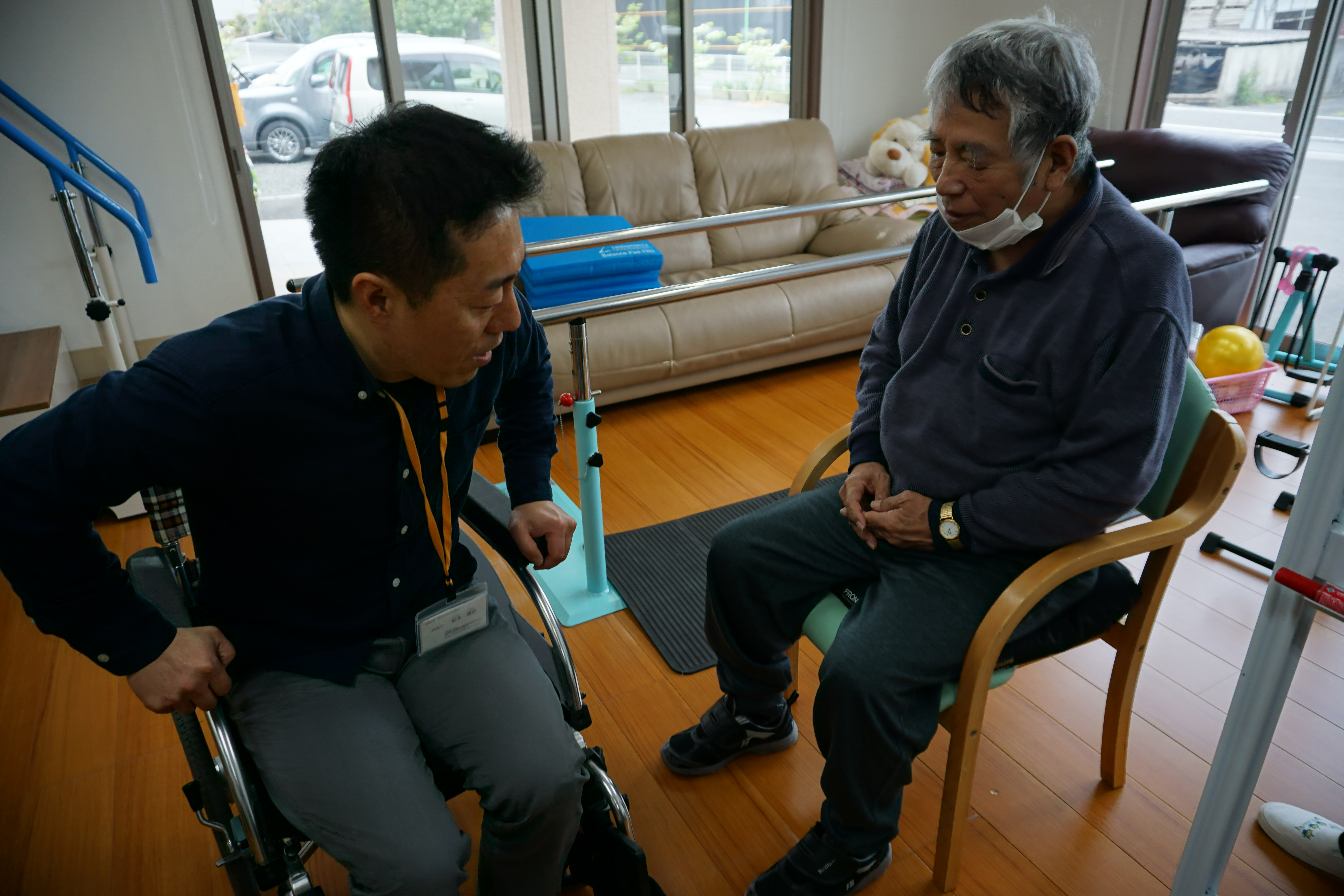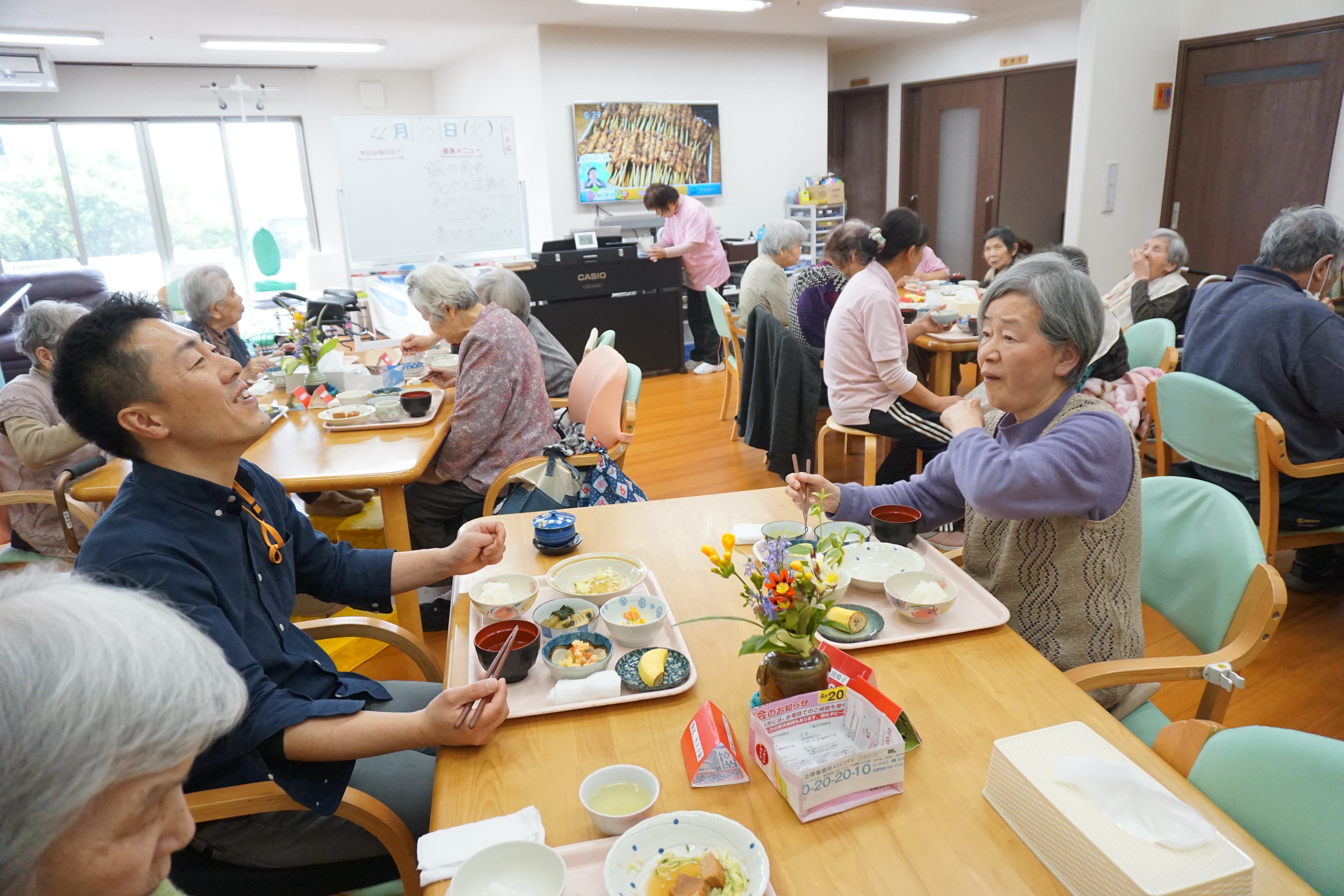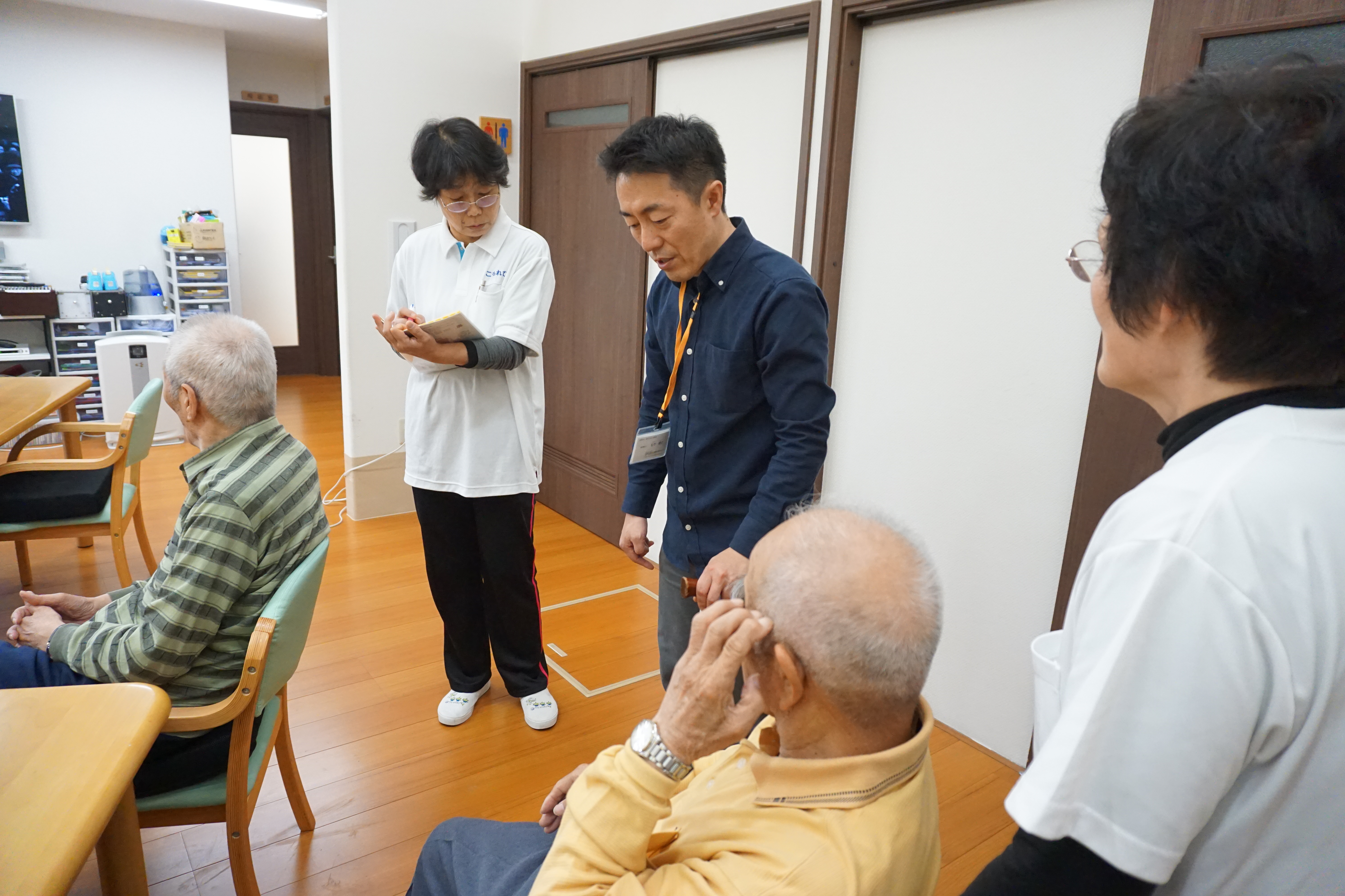 先日、4月17日に「生活リハビリ」の達人こと「松本健史先生」が職員研修および機能訓練のアドバイスに「デイサービスこもれび」においで下さいました。先月に引き続いて「生活リハビリ」のレクチャーを受けました。松本先生は食事は必ず利用者様と一緒に取られます。リハビリのアドバイスをされる時も、目線はいつも利用者様の目線です。相手の立場にいつも立たれています。本当に勉強になります。午後からの職員研修では今回も最後に「機能訓練指導員が15分程度、機能訓練をしただけなら大して効果はありません。トイレに行くときの歩行、風呂場に行くときの歩行、椅子からの移動の際の立ち上がり、これらすべてが機能訓練と考えると非常に効果があります。生活すべてがリハビリテーションです。」と言われました。私も同感です。「デイサービスこもれび」は、リハビリテーションについて職員の意識改革を行っています。(デイサービスに動画を配信しています。今回は音楽活動です。「こもれび西条」で検索してください。)